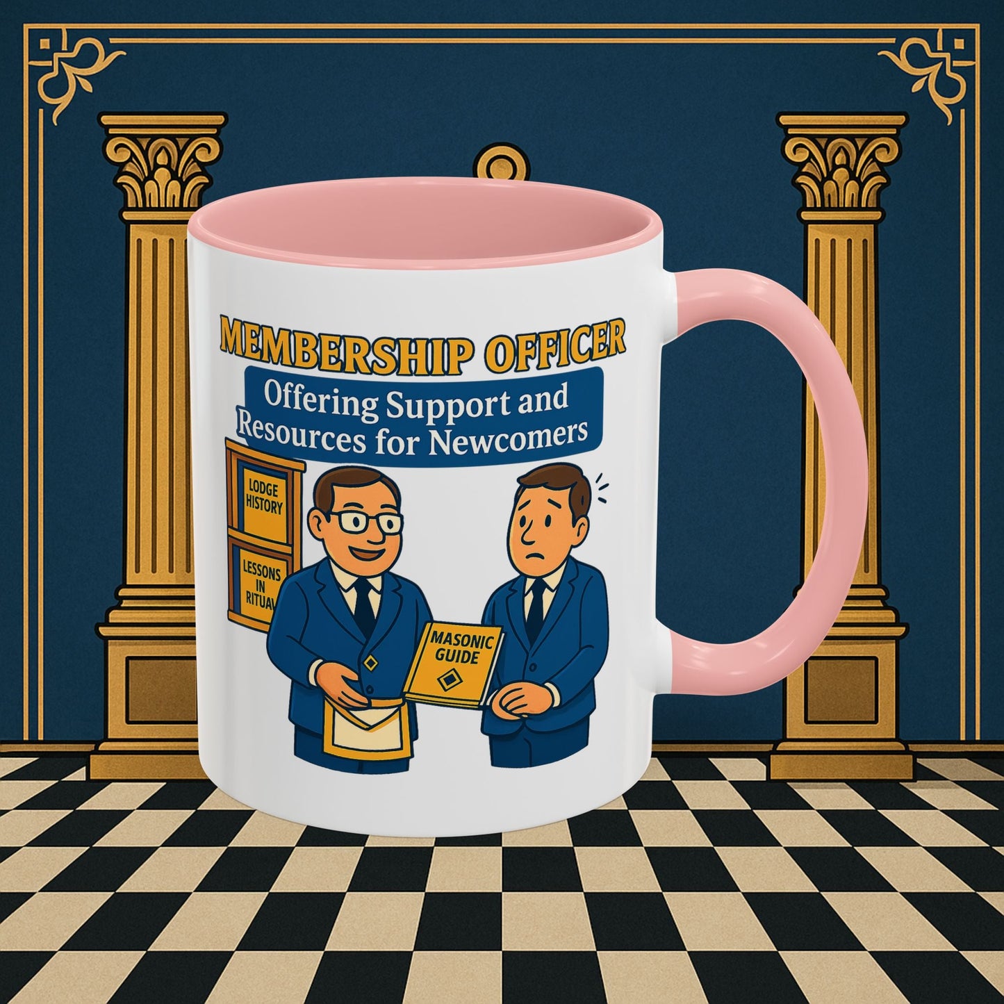 Premium Personalised Freemason Colour Rim Mug - Membership Officer Design Offering support and resources for newcomers